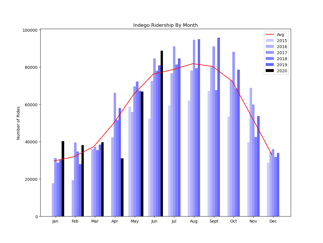Indego started 2020 off with an extremely high ridership level- there was 25% more rides in January than in that month during previous years. February's ridership level dropped a little bit, but was still higher than that month in most previous years.