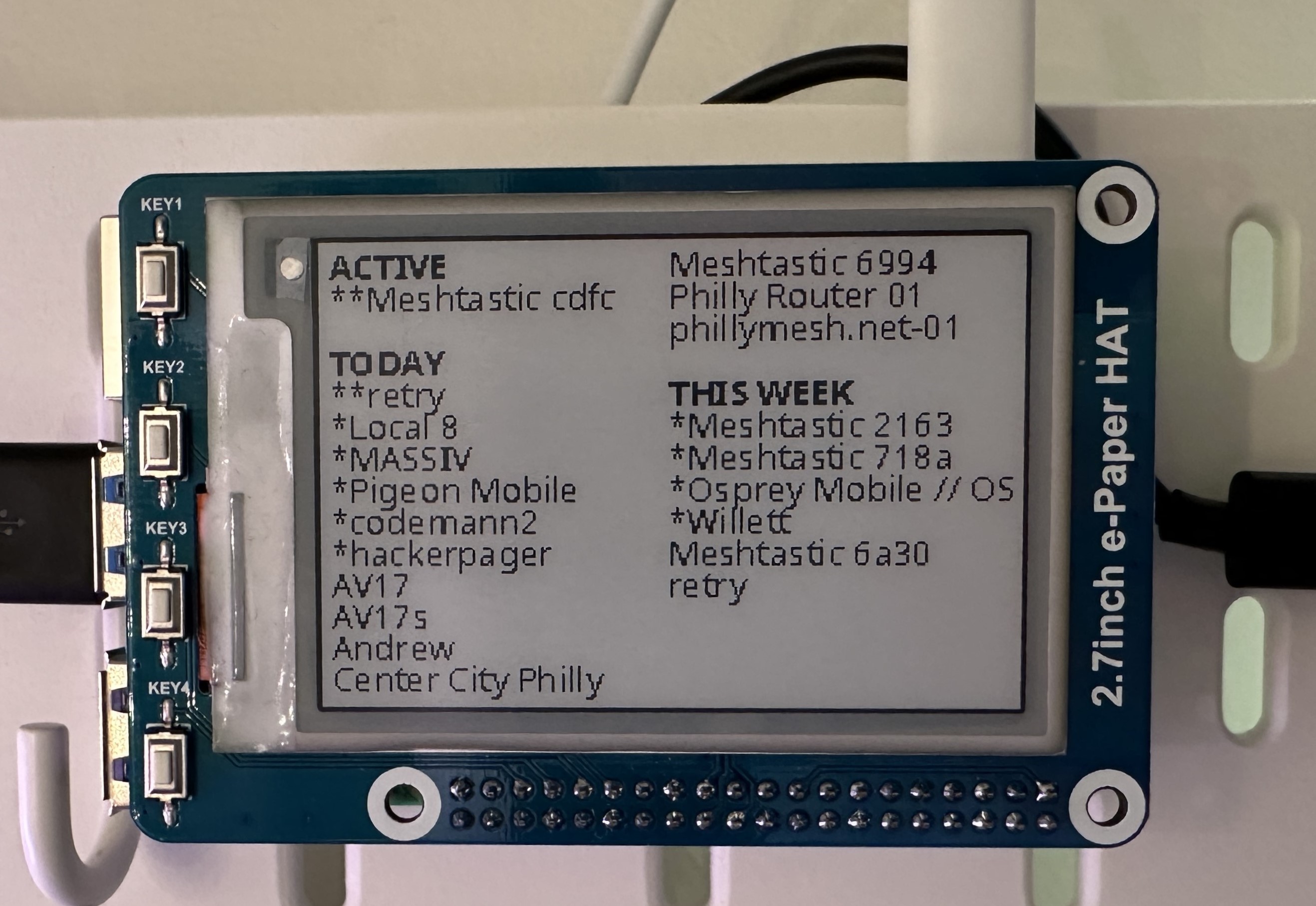 I have a node mounted on a pegboard next to my desk that I leave there all the time. When I come home, I often grab my phone to see if any new nodes have appeared since the last time I checked. It occurred to me that a Buddy List on an ePaper display next to the node on my pegboard could highlight new nodes as well as show me which ones are currently active, without needing to take the time to connect my phone.