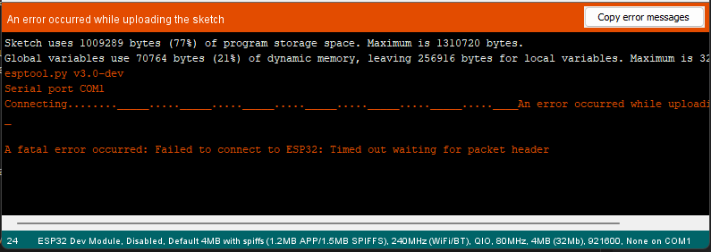 How do you know which COM port to select? To be quite honest, I don't know. I always just guess. You will get an error like the one below saying the connection timed out if you pick the wrong one.