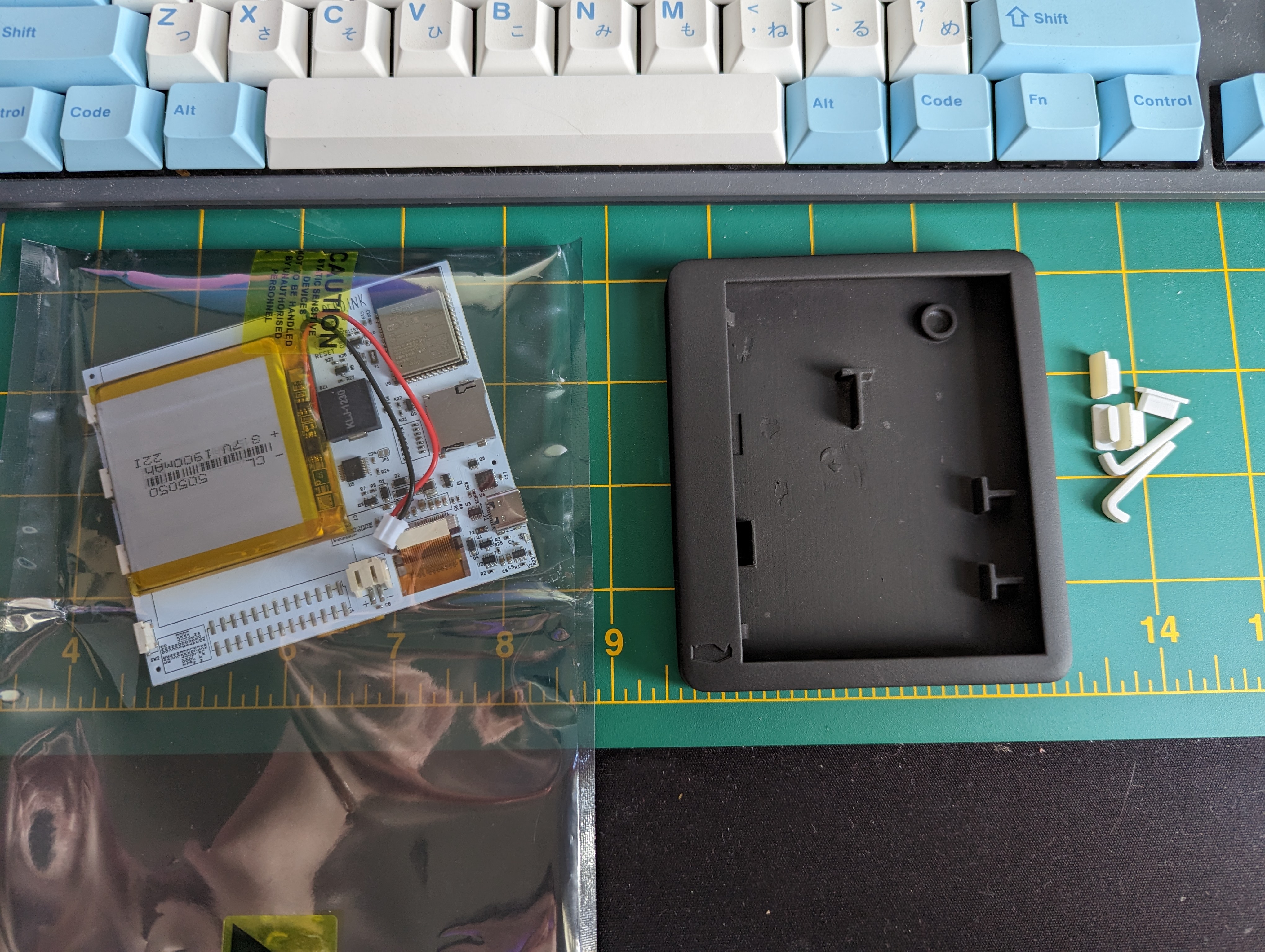 Next I put the case together, and right away I encountered an issue. The battery had been mounted too high on the circuit board and it interfered with two T-shaped plastic tabs on the inside of the back of the case.