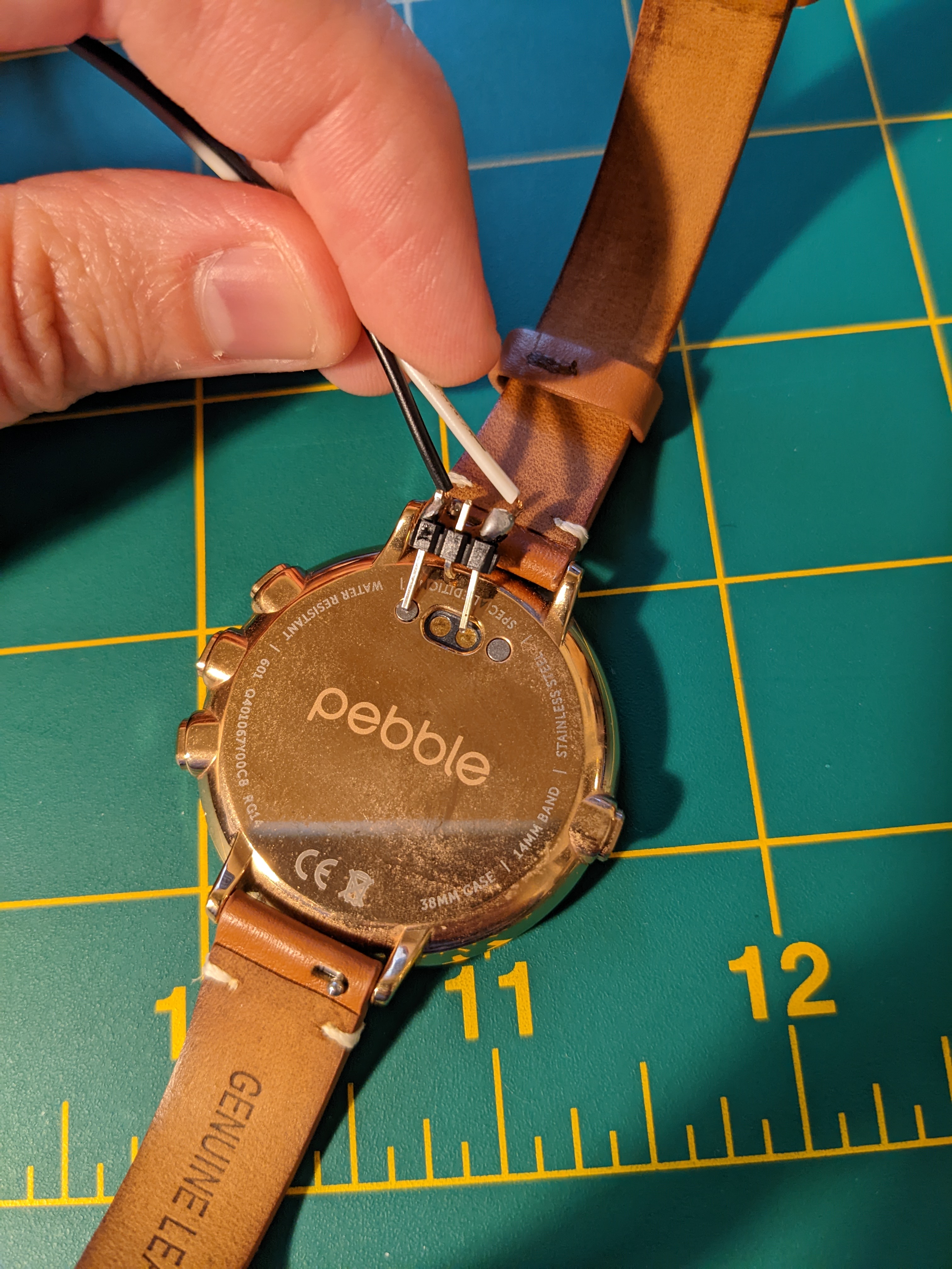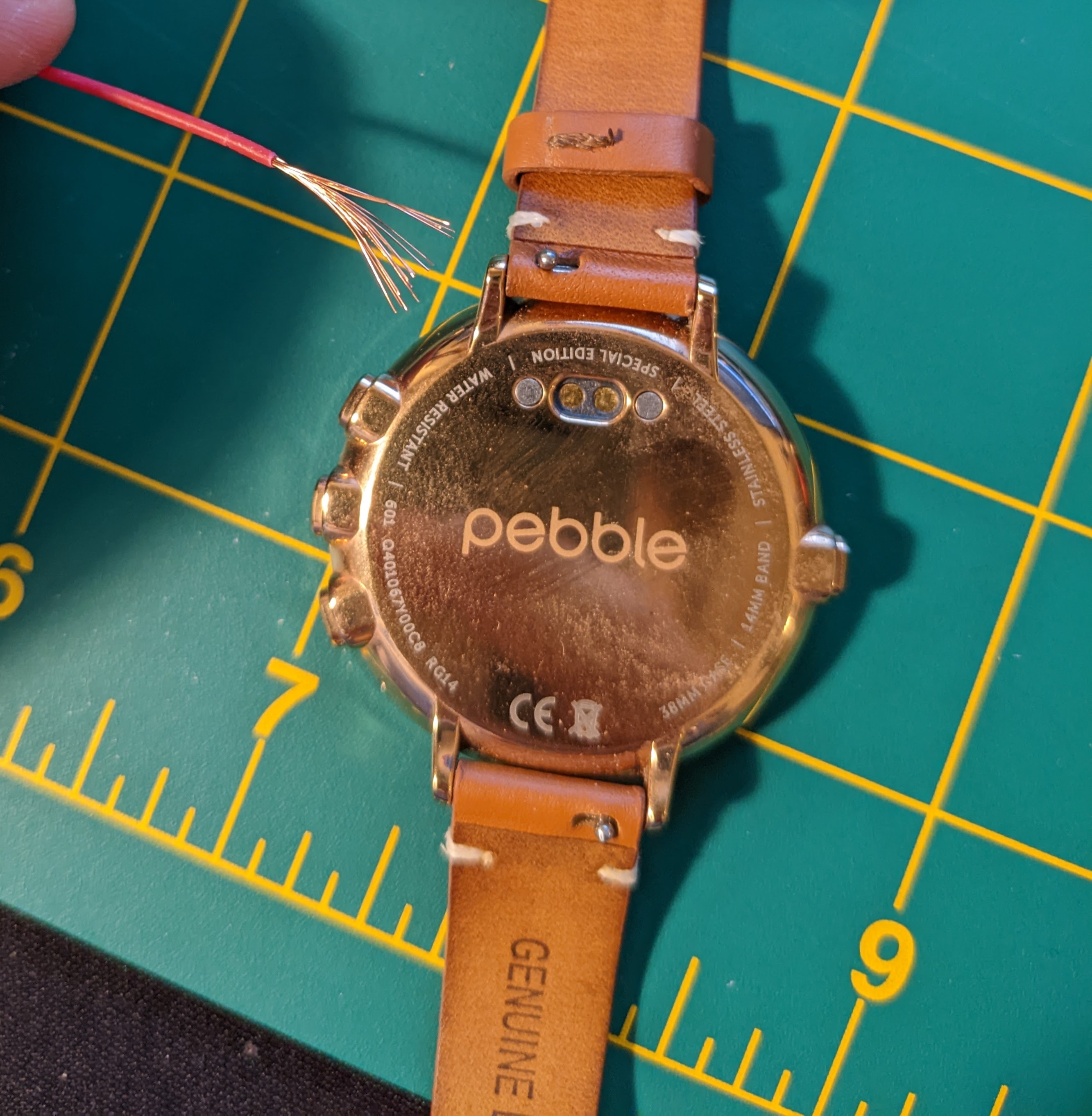 With your soldering iron, solder the stranded wires to the solid wires, and then cover them either with heat shrink or electrical tape. You can then push the hard ends of the solid wire onto the contacts of the Pebble and hold them there to charge. You will need to keep your hands steady to make sure they don't move off the tiny contacts. If your hands and the wires make contact with the wrong pads, you may see some sparks. Your Pebble battery won't immediately die, but I don't recommend doing this too many times.