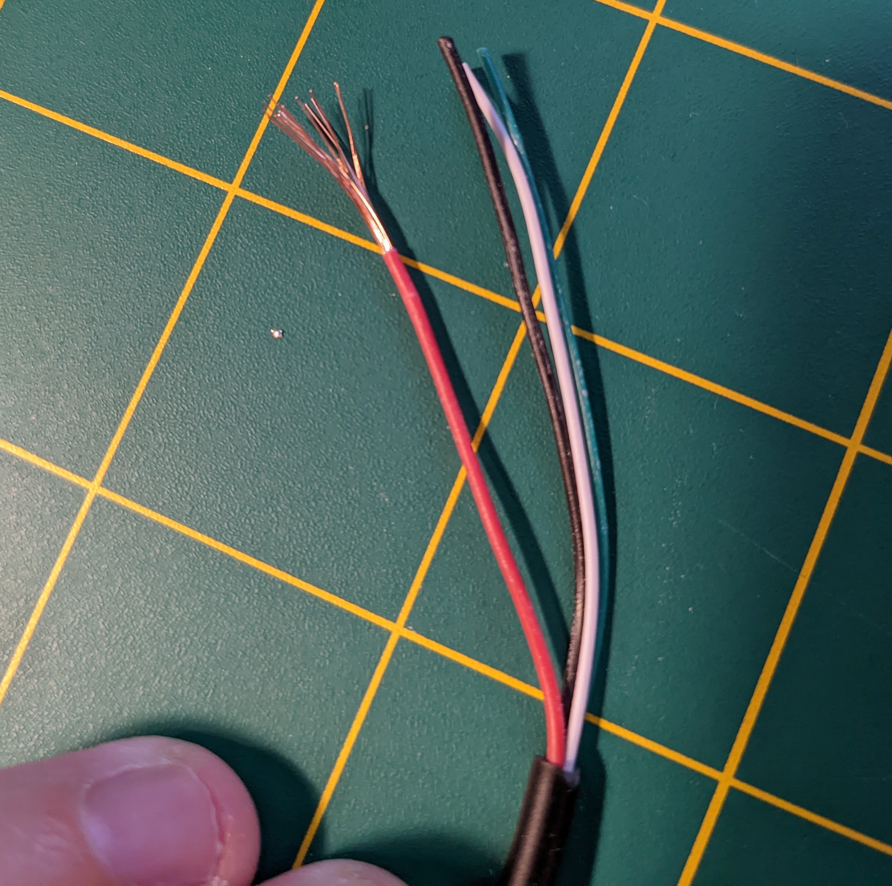 When you strip the voltage or ground wire you'll see that it is stranded. Technically you could just strip the red voltage wire and the black ground wire and then hold them on the appropriate contacts, but in practice this is very difficult. Getting a proper contact with two stranded wires onto the tiny charging contacts and holding them there is next to impossible. It took me about an hour to hold the wires in exactly the right place to get a full charge, and it should only take about 15 minutes with a proper charger. I needed to find a better way.